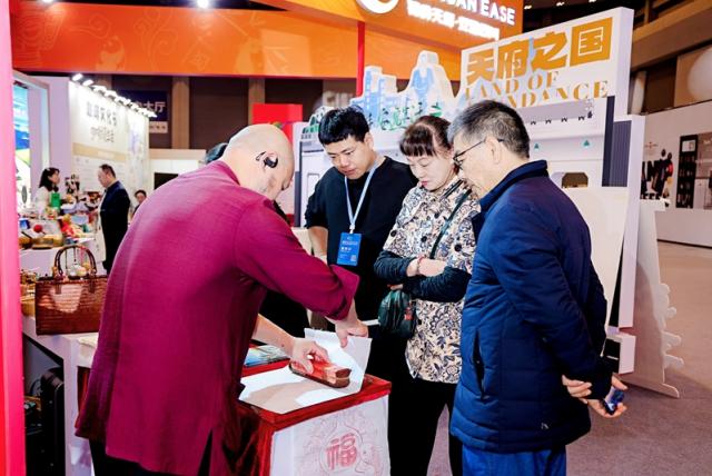 本次四川展台位于重庆国际博览中心中央大厅核心区域,突出展示“锦绣天府·安逸四川”文旅品牌,围绕熊猫家园、古蜀文明、天府之国、安逸四川、世界级旅游风景道等多个特色鲜明的主题打造展区,“蜀礼蜀器文创展区”以诸葛羽扇纶巾杯套组、金沙拾贝等摆件绽放匠心光华;钵钵鸡、叶儿粑、甜皮鸭等天府旅游美食,传递浓浓的四川烟火气;宜宾面塑、长宁竹编、夹江年画等非遗活态体验让参展嘉宾在现场就能感受四川丰富的非遗文化。