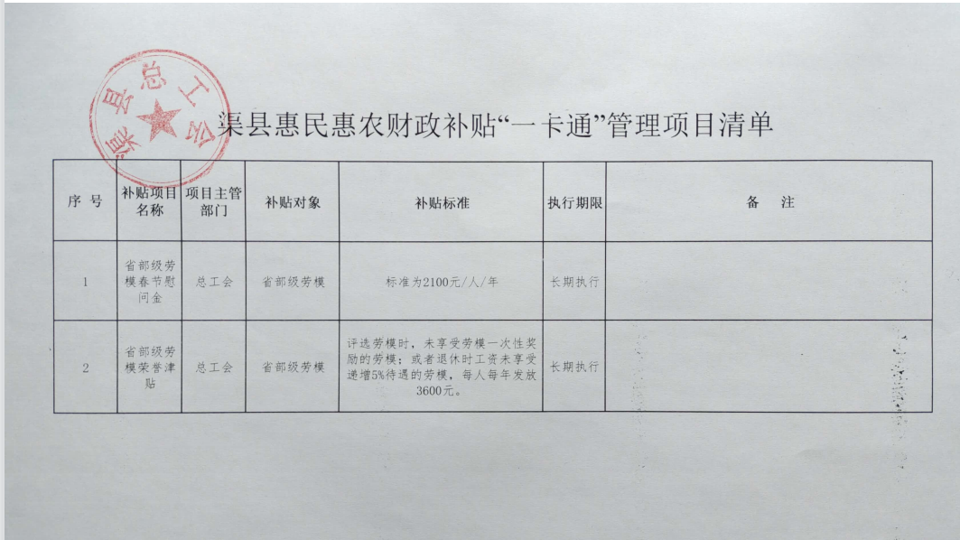 渠县惠民惠农财政补贴“一卡通”管理项目清单(总工会2023年)