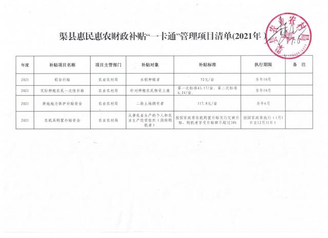 渠县惠民惠农财政补贴“一卡通”管理项目清单(2021年)