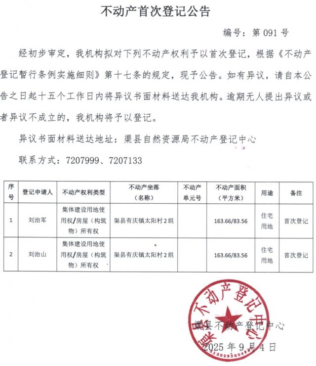 不动产权利首次登记公告--刘治军、刘治山
