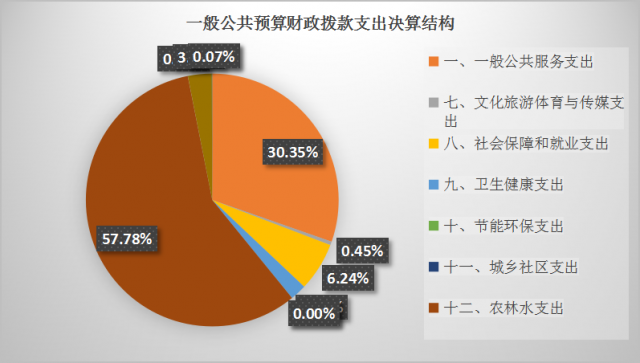2024年度一般公共预算财政拨款支出1442.36万元,主要用于以下方面:一般公共服务支出437.82万元(30.35%);文化旅游体育与传媒支出6.50万元(0.45%);社会保障和就业支出89.94万元(6.24%);卫生健康支出30.04万元(2.08%);农林水支出833.36万元(57.78%);住房保障支出43.70万元(3.03%);灾害防治及应急管理支出1万元(0.07%)。