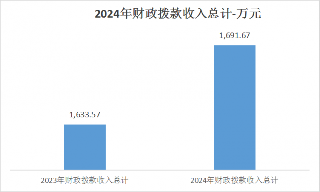2024年度财政拨款收入、支出总计均为1691.72万元。与2023年度相比,财政拨款收入总计、支出总计各增加58.10万元,增长3.56%。主要是2024年专项运转类经费项目、鸡山村山坪塘整治项目、污水处理厂支管网建设项目、退役军人服务站打造经费等一次性项目资金增加。