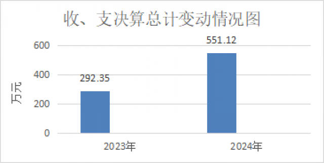 2024年度收、支总计均为551.12万元。与2023年相比,收、支总计各增加258.76万元,增长88.51%。主要变动原因是2024年增加考试考务费等258.76万元,其中一般公共预算财政拨款增加44.32万元,政府性基金预算财政拨款增加214.44万元。
