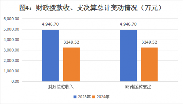2024年度财政拨款收入、支出总计均为3249.52万元。与2023年度相比,财政拨款收入总计、支出总计各减少1697.18万元,下降34.31%。主要变动原因是重点项目支出减少。