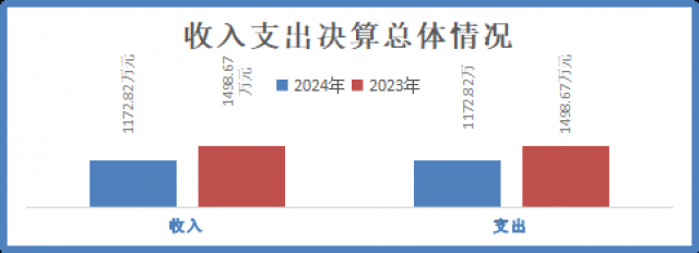 2024年度收入总计1172.82万元,支出总计1172.82万元。与2023年相比,收入总计减少325.85万元、支出总计减少325.85万元,收入减少27.78%,支出减少27.78%。主要变动原因是人员经费和项目减少。