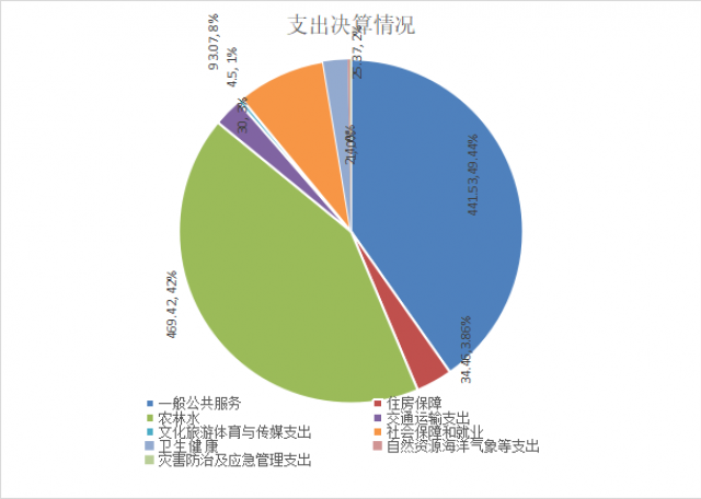 2024年一般公共预算财政拨款支出1110.81万元,主要用于以下方面:一般公共服务(类)支出447.08万元,占40.25%;文化旅游体育与传媒支出(类)支出4.5万元,占0.41%;社会保障和就业(类)支出93.07万元,占8.38%;卫生健康(类)支出25.37万元,占2.28%;农林水(类)支出469.42万元,占42.26%;交通运输支出(类)支出30万元,占2.7%;自然资源海洋气象等支出(类)支出2.4万元,占0.22%;住房保障(类)支出37.97万元,占3.42%;灾害防治及应急管理支出(类)支出1万元,占0.09%