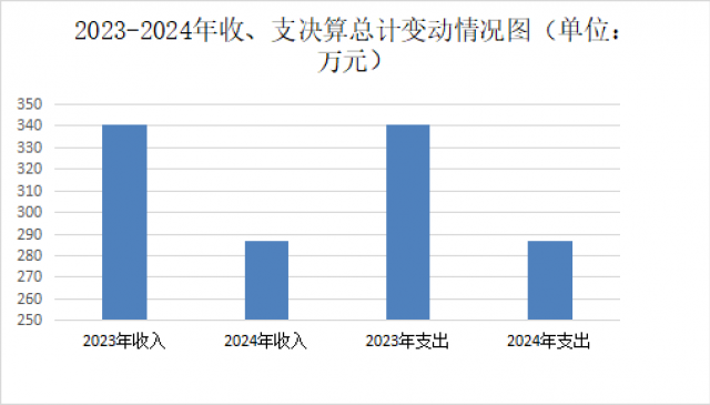 2024年度收入、支出总计均为286.5万元。与2023年度相比,收入、支出总计各减少54.15万元,下降18.9%。主要变动原因是本年度无政府性基金预算财政拨款,以及一般公共预算财政拨款减少。