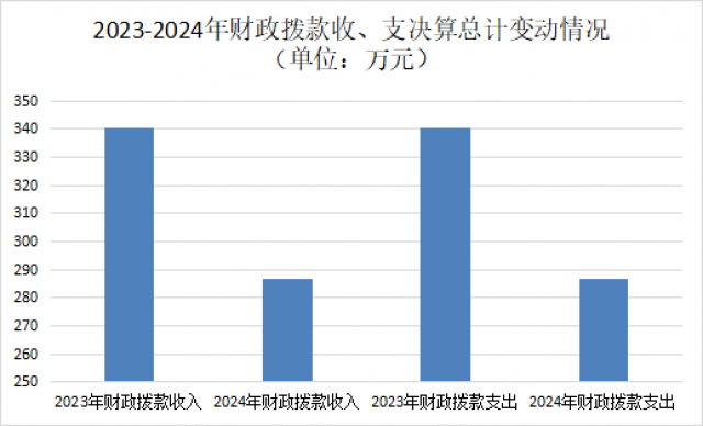 2024年度财政拨款收入、支出总计均为286.5万元。与2023年度相比,财政拨款收入总计、支出总计各减少54.15万元,下降18.9%。主要变动原因是本年度无政府性基金预算财政拨款,以及一般公共预算财政拨款减少。