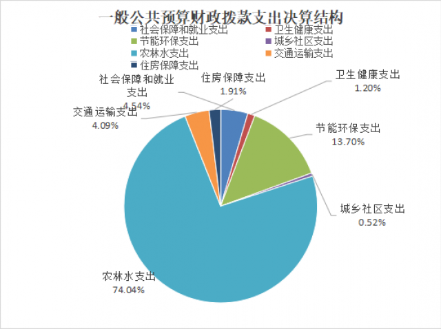 2024年度一般公共预算财政拨款支出4619.02万元,主要用于以下方面:社会保障和就业支出209.56万元,占4.54%;卫生健康支出55.65万元,占1.20%;节能环保支出632.70万元,占13.70%;城乡社区支出24.00万元,占0.52%;农林水支出3419.93万元,占74.04%;交通运输支出189.00万元,占4.09%;住房保障支出88.19万元,占1.91%。