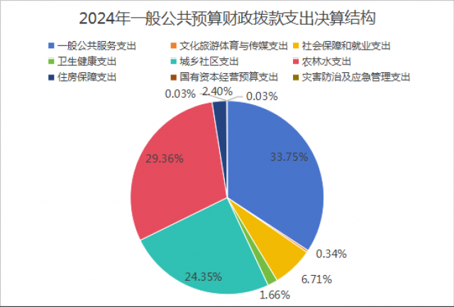 2024年度一般公共预算财政拨款支出3134.13万元,主要用于以下方面:一般公共服务支出1057.76万元,占33.75%;文化旅游体育与传媒支出10.50万元,占0.34%;社会保障和就业支出210.30万元,占6.71%;卫生健康支出52.16万元,占1.66%;城乡社区支出763.24万元,占24.35%;农林水支出920.03万元,占29.36%;住房保障支出75.37万元,占2.40%;国有资本经营预算支出1.00万元,占0.03%;灾害防治及应急管理支出1.00万元,占0.03%。