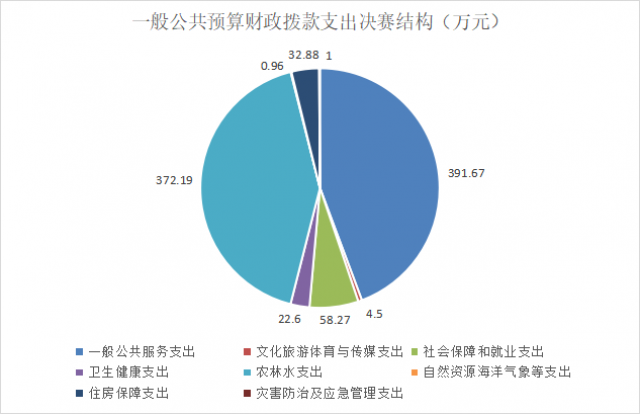 2024年度一般公共预算财政拨款支出884.06万元,主要用于以下方面:一般公共服务支出391.67万元,占44.30%;文化旅游体育与传媒支出4.50万元,占0.51%;社会保障和就业支出58.27万元,占6.59%;卫生健康支出22.60万元,占2.56%;农林水支出372.19万元,占42.10%;自然资源海洋气象等支出0.96万元,占0.11%;住房保障支出32.88万元,占3.72%;灾害防治及应急管理支出1万元,占0.11%。