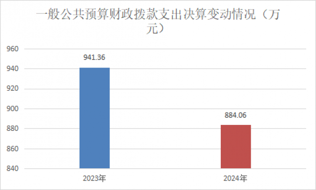 2024年度一般公共预算财政拨款支出884.06万元,占本年支出合计的85.46%。与2023年度相比,一般公共预算财政拨款支出减少57.3万元,下降6.09%。主要变动原因是机构改革。