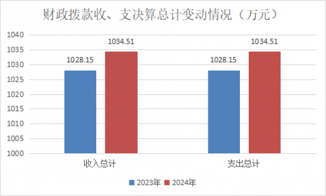 2024年度财政拨款收入、支出总计均为1034.51万元。与2023年度相比,财政拨款收入总计、支出总计各增加6.36万元,增长0.62%。主要变动原因是机构改革,人员增加。