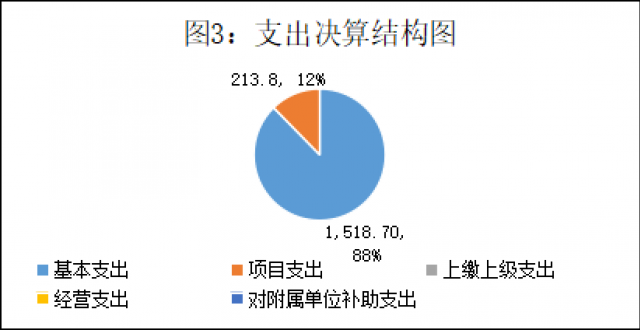 2024年度本年支出合计1732.50万元,其中:基本支出1518.70万元,占88%;项目支出213.80万元,占12%;上缴上级支出0万元,占0%;经营支出0万元,占0%;对附属单位补助支出0万元,占0%。