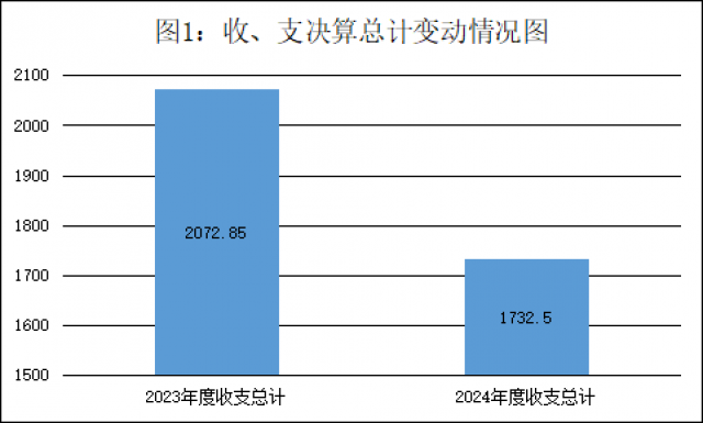2024年度收、支总计均为1732.50万元。与2023年度相比,收、支总计各减少340.35万元,下降了16.42%。主要变动原因是抚恤金、退休一次性补贴减少。