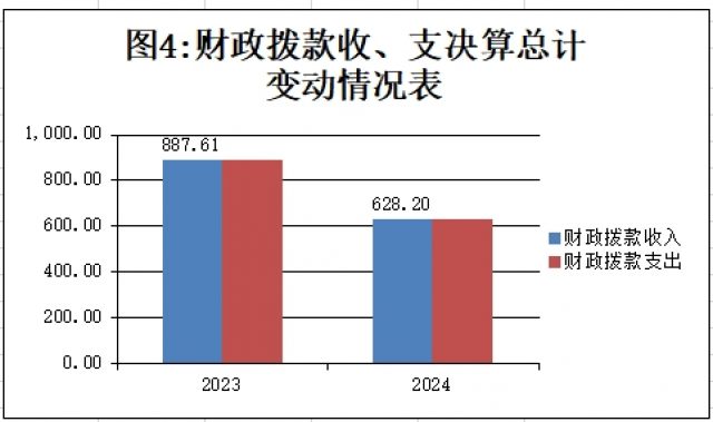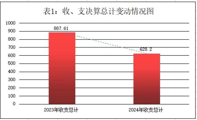 2024年度收入、支出总计均为628.2万元。与2023年度相比,收入、支出总计各减少259.41万元,下降29.23%。主要变动原因是减少预算内暂付款和人员减少(退休2人,调出1人)。