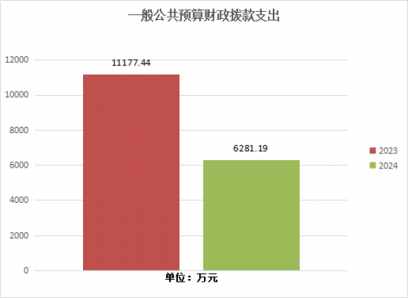 2024年度一般公共预算财政拨款支出6,281.19万元,占本年支出合计的11.7%。与2023年度相比,一般公共预算财政拨款减少4,896.25万元,下降43.8%。主要变动原因是本年一般预算项目支出下降