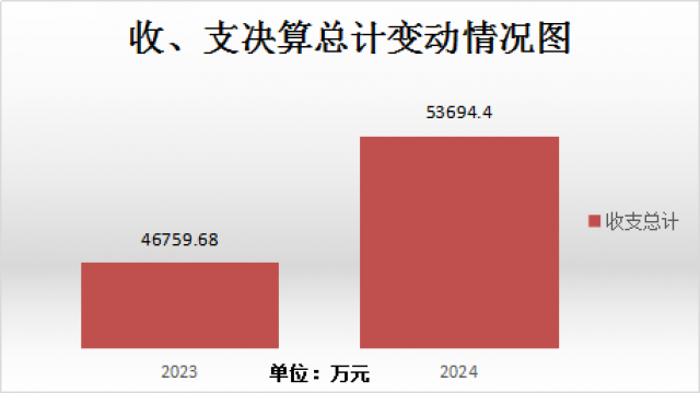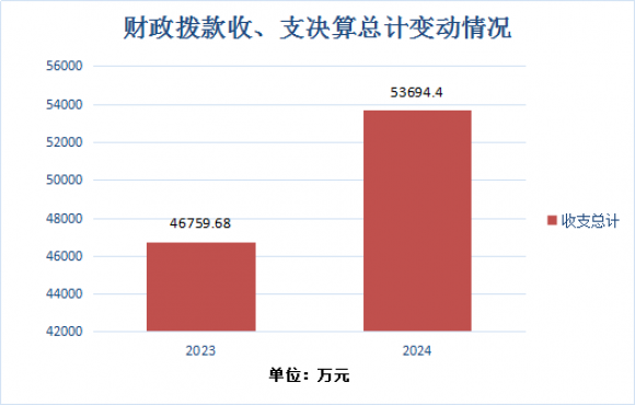 2024年度财政拨款收入、支出总计均为53,694.4万元。与2023年度相比,财政拨款收入、支出总计各增加6,934.72万元,增长14.8%。主要变动原因是本年项目支出增加。