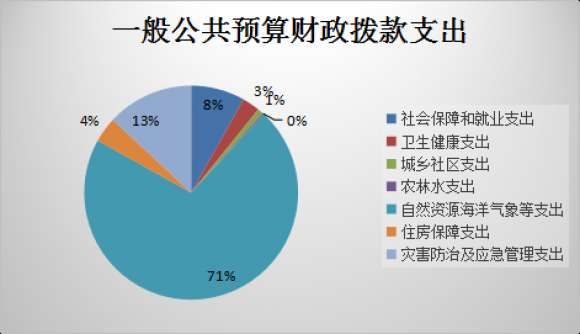 2024年度一般公共预算财政拨款支出6,281.19万元,主要用于以下方面: 社会保障和就业支出512.02万元,占8.2%;卫生健康支出167.7万元,占2.7%;城乡社区支出53.41万元,占0.8%;农林水支出14.67万元,占0.2%;自然资源海洋气象等支出4,471.61万元,占71.2%;住房保障支出239.86万元,占3.8%;灾害防治及应急管理支出821.93万元,占13.1%。