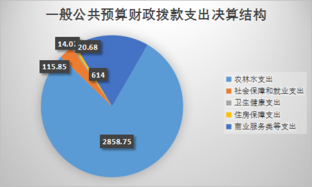 2024年度一般公共预算财政拨款支出3623.34万元,主要用于以下方面:农林水支出2858.75万元,占78.9%;社会保障和就业支出115.85万元,占3.2%;卫生健康支出14.07万元,占0.4%;住房保障支出20.68万元,占0.6%;商业服务业等支出614万元,占16.9%。