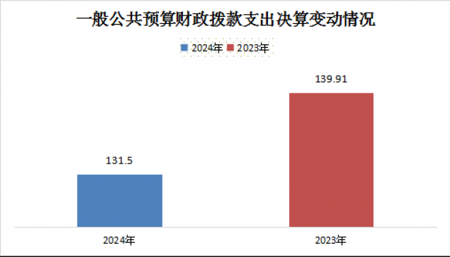 2024年度一般公共预算财政拨款支出131.50万元,占本年支出合计的100%。与2023年度相比,一般公共预算财政拨款支出减少8.42万元,降幅6.02%。主要变动原因是人员退休,预算减少。