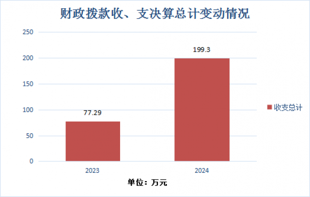2024年度财政拨款收入、支出总计均为199.3万元。与2023年度相比,财政拨款收入、支出总计各增加122.01万元,增长157.9%。主要变动原因是本年度日常公用经费和项目支出增加。