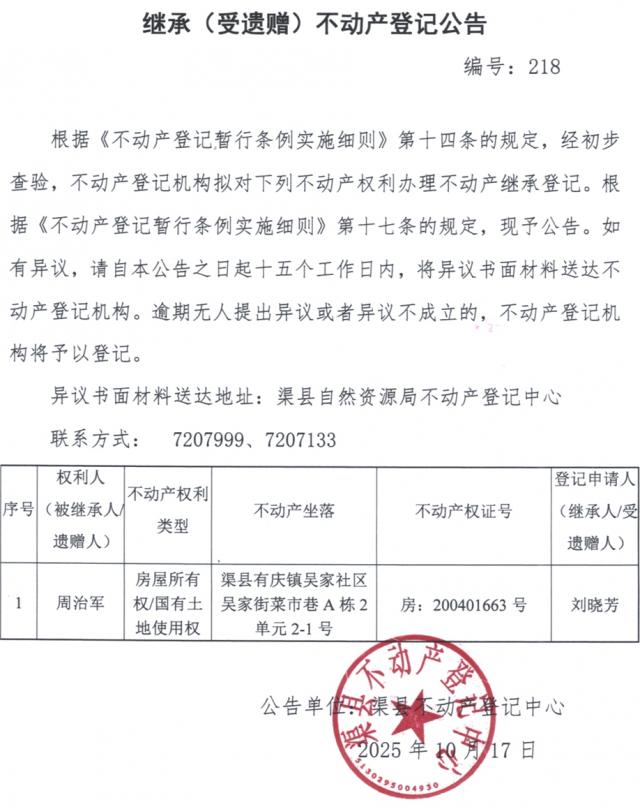 不动产权利继承登记公告--刘晓芳