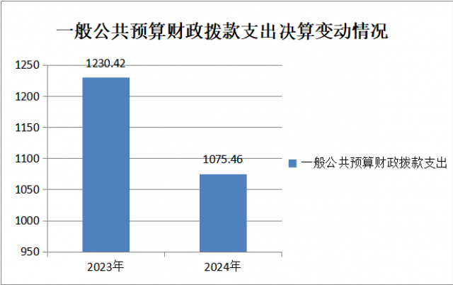 2024年度一般公共预算财政拨款支出1075.46万元,占本年支出合计的100%。与2023年度相比,一般公共预算财政拨款支出减少154.96万元,减少12.59%。主要变动原因是人员经费、公用经费、项目经费均减少。(图5:一般公共预算财政拨款支出决算变动情况)