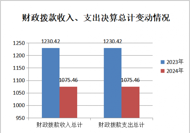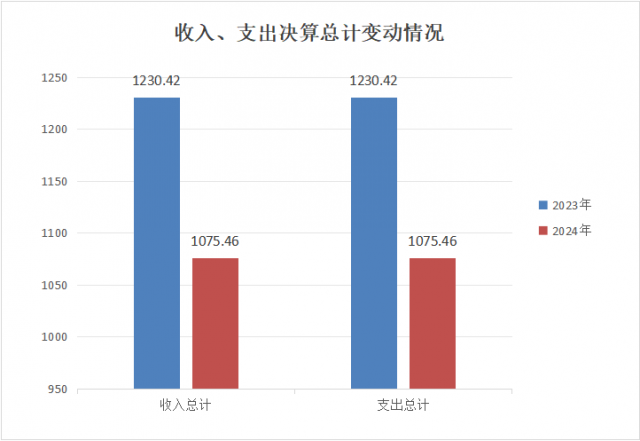 2024年度收、支总计均为1075.46万元。与2023年度相比,收、支总计各减少154.96万元,具体下降比例为12.59%。主要变动原因是年初预算安排的各项经费减少幅度大于年中追加经费,导致总体下降。(图1:收入、支出决算总计变动情况图)