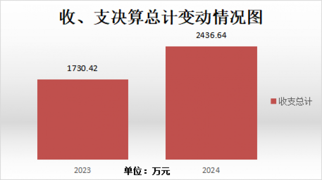 2024年度收入、支出总计均为2,436.64万元。与2023年度相比,收入、支出总计各增加706.21万元,增长40.8%。