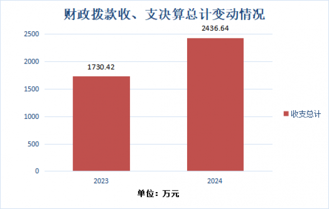 2024年度财政拨款收入、支出总计均为2,436.64万元。与2023年度相比,财政拨款收入、支出总计各增加706.21万元,增长40.8%。
