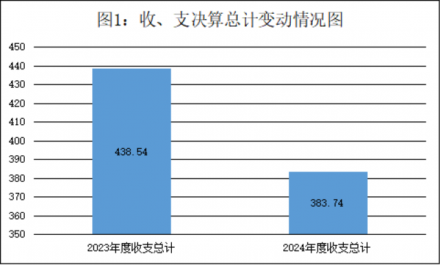 2024年度收、支总计均为383.74万元。与2023年度相比,收、支总计各减少54.8万元,减少11.4%。主要变动原因是人员减少。