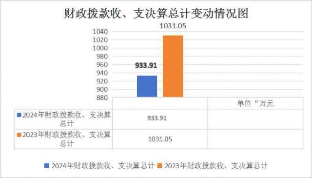 2024年度财政拨款收入支出总计均为933.91万元。与2023年度相比,财政拨款收入支出总计各减少97.14万元,减少9.42%。主要变动原因是2023年度有政府性基金预算财政拨款,2024年度无政府性基金预算财政拨款,而一般公共预算财政拨款略有增加。