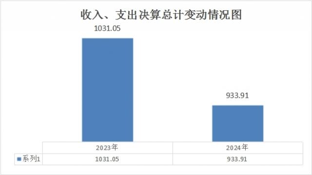 2024年度收入支出总计均为933.91万元,与2023年度相比,收入支出总计各减少97.14万元,减少9.42%。主要变动原因是2023年度有政府性基金预算财政拨款,2024年度无政府性基金预算财政拨款,而一般公共预算财政拨款略有增加。