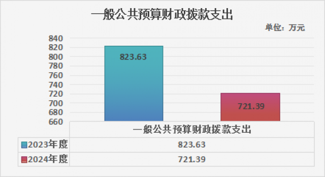 2024年度一般公共预算财政拨款支出721.39万元,占本年支出合计的100%。与2023年度823.63万元相比,一般公共预算财政拨款支出减少102.24万元,减少12.41%。主要变动原因是人员减少。