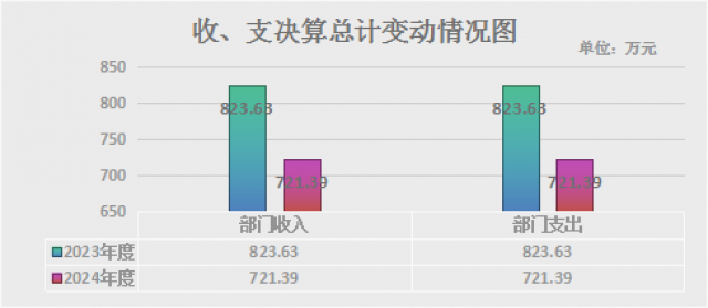 2024年度收、支总计均为721.39万元。与2023年度823.63万元相比,收、支总计各减少102.24万元,减少12.41%。主要变动原因是人员减少。