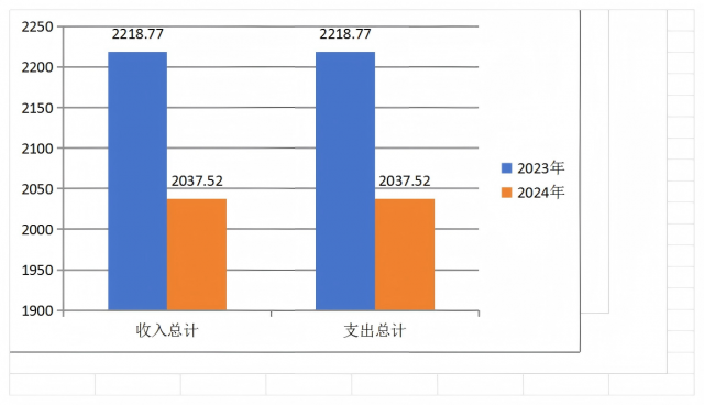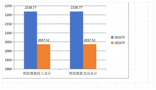 2024年度财政拨款收入、支出总计均为2037.52万元。与2023年度相比,财政拨款收入总计、支出总计各减少181.25万元,下降8.17%。主要变动原因是按实际情况预算的公用经费,比上年度减少;本年度项目预算减少,无政府性基金预算。