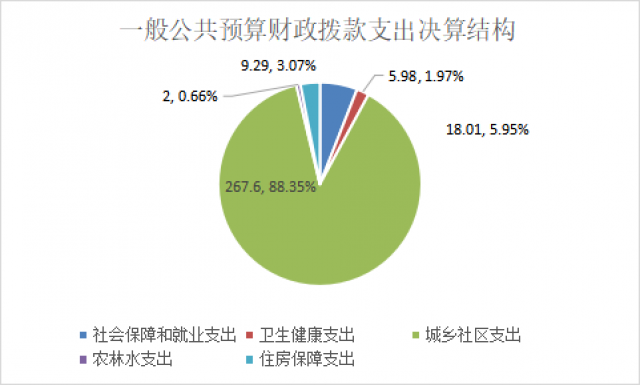 2024年度一般公共预算财政拨款支出302.88万元,主要用于以下方面:城乡社区支出267.6万元,占88.35%;农林水支出2万元,占0.66%;社会保障和就业支出18.01万元,占5.95%;卫生健康支出5.98万元,占1.97%;住房保障支出9.29万元,占3.07%。(注:仅罗列本部门涉及的全部功能分类科目,至类级)