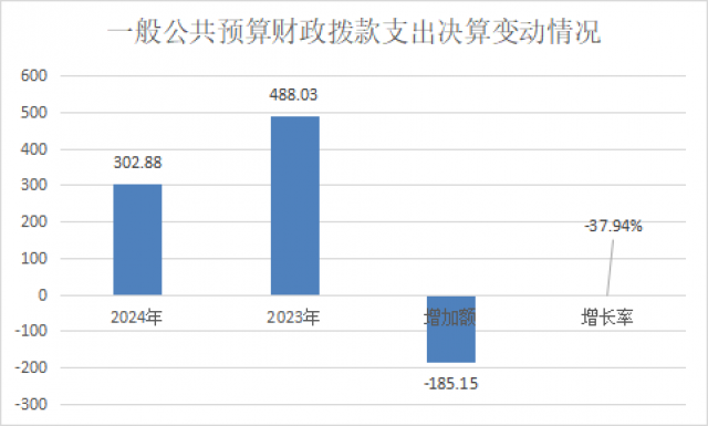 2024年度一般公共预算财政拨款支出302.88万元,占本年支出合计的12.41%。与2023年度相比,一般公共预算财政拨款支出减少185.15万元,下降37.94%。主要变动原因是2024年全县铁路沿线安全环境整治“双段长”制工作经费纳入政府性基金预算财政拨款收入。