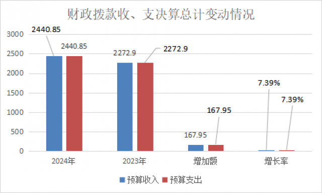 2024年度财政拨款收入、支出总计均为2440.85万元。与2023年度相比,收入、支出总计均增加167.95万元,增长7.39%。主要变动原因是增加2024年城镇污水城乡垃圾处理设施建设资金。