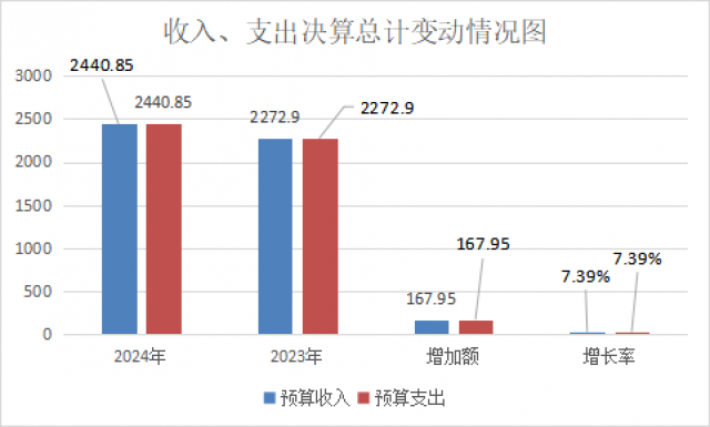 2024年度收入、支出总计均为2440.85万元。与2023年度相比,收入、支出总计均增加167.95万元,增长7.39%。主要变动原因是增加2024年城镇污水城乡垃圾处理设施建设资金。