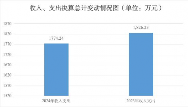 2024年度收入、支出总计均为1774.24万元。与2023年度收、支总计均为1826.23万元相比,收入、支出合计减少51.99万元,下降2.85%。主要变动原因是人员支出减少。