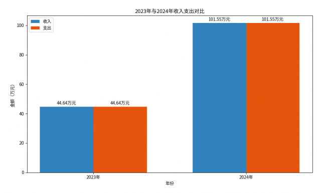 2024年度收入、支出总计均为101.55万元。与2023年度相比,收入、支出总计各增加56.91万元,增长率为127.48%。主要变动原因是人员经费、项目经费增加。
