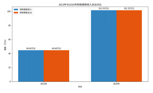 2024年度财政拨款收入、支出总计均为101.55万元。与2023年度相比,财政拨款收入总计、支出总计各增加56.91万元,增长率为127.48%。主要变动原因是人员经费、项目经费增加。