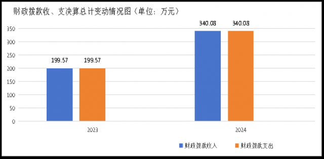 2024年度财政拨款收入、支出总计均为340.08万元。与2023年度相比,财政拨款收入总计、支出总计各增加140.51万元,增长70.41%。主要变动原因是12名调动人员工资2023年度在原单位发放,2024年度在我单位发放。