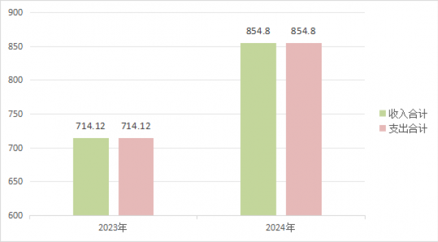 2024年度收、支总计854.80万元。与2023年相比,收、支总计各增加195.13万元,增长19.7%。主要变动原因是事业收入增加。