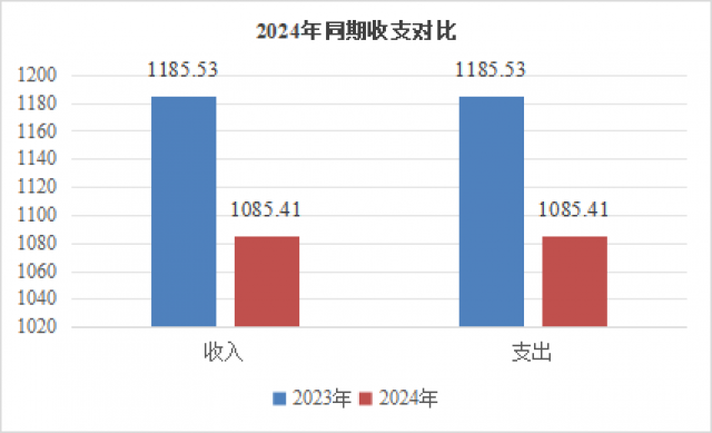 2024年度收入、支出总计均为1085.41万元。与2023年度相比,收入、支出总计各减少100.12万元,减少8.4%。与2023年度相比,收入、支出总计各减少100.12万元,降幅8.4%,整体收支规模同比下降。