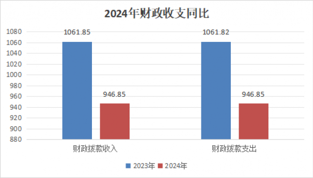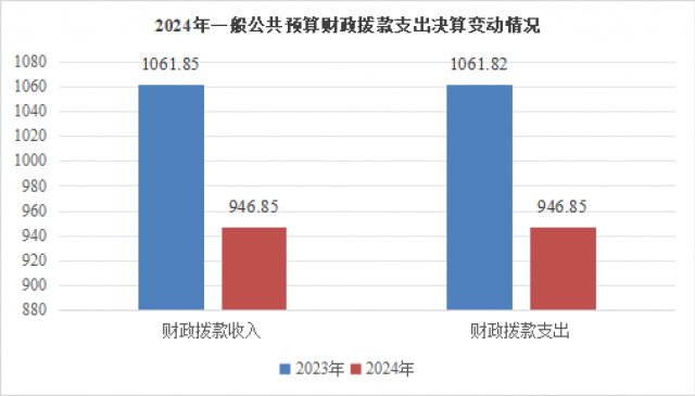2024年度财政拨款收入、支出总计均为946.82万元。与2023年度相比,财政拨款收入总计、支出总计各减少114.97万元,下降10.83%。主要变动原因是2024年财政拨款收入中,医务人员临时性工作补贴、一次性抚恤金及退休人员补贴等项目的预算较2023年有所减少。