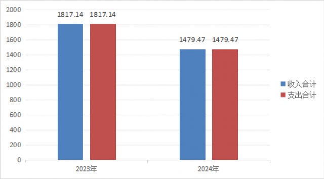 2024年度收入、支出总计均为1479.47万元。2023年度收入、支出总计均为1817.14万元,与2023年度相比,收入、支出总计各减少337.67万元,下降18.58%。主要变动原因是本年度财政拨款收入减少,业务收入减少。