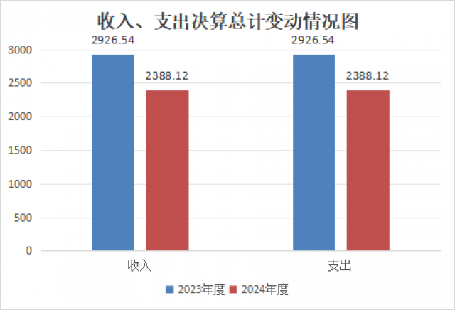 2024年度收入、支出总计均为2388.12万元。与2023年度相比,收入、支出总计各减少538.42万元,下降18.40%。主要变动原因:一是财政实行卫生院定额补助,预算经费减少,二是随医改政策深入,受医保政策的影响,事业收入比去年同期大幅下降导致预算收入支出的减少。